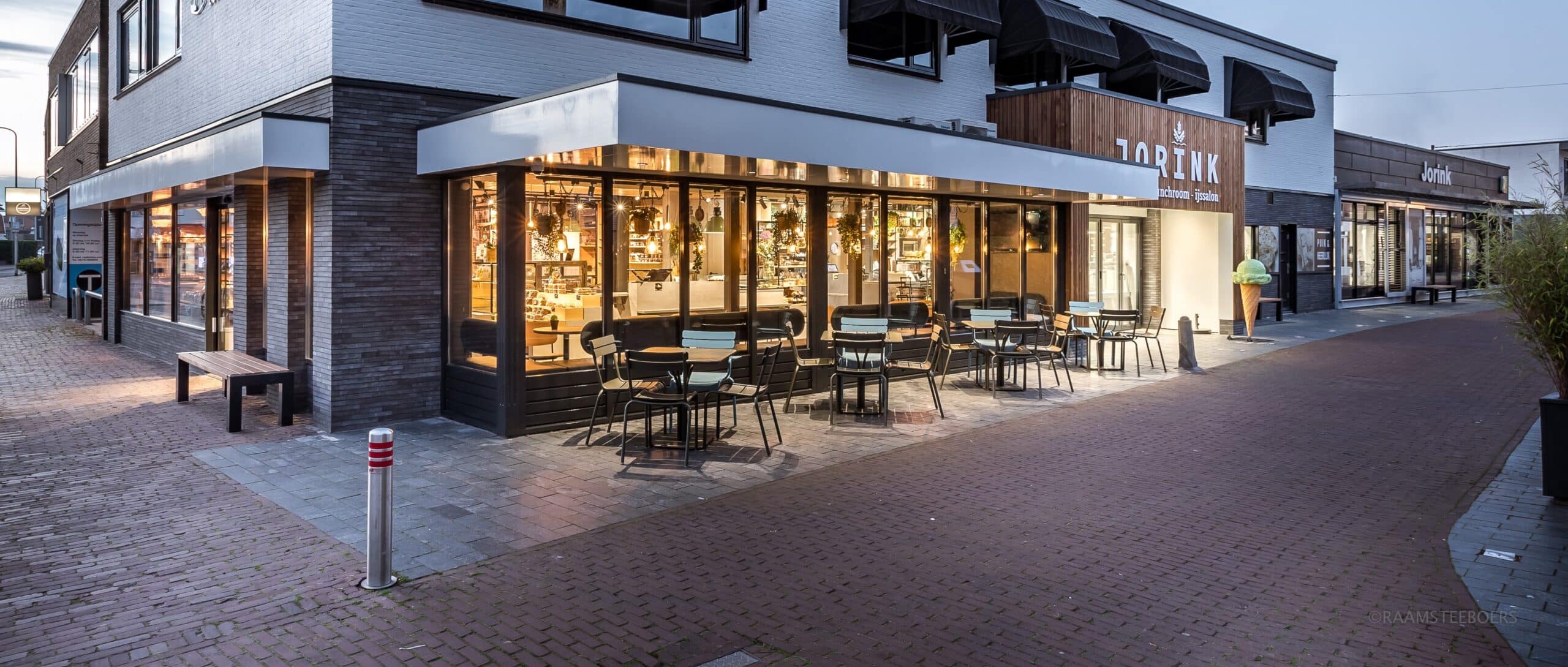 Dat is gebeurd en Jorink heeft gekozen voor een in- en uitpandige renovatie; een geveltransformatie met nieuwe entree, plus een nieuwe indeling voor de winkel, de ijssalon en de lunchroom. Hierbij zijn de vloer, het plafond en het interieur volledig aangepakt.