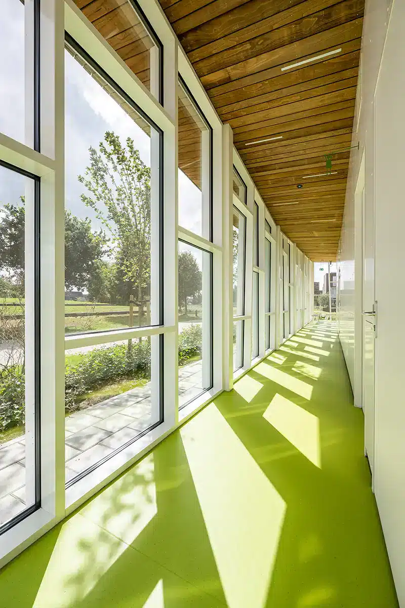 Duurzaamheid is integraal onderdeel van het ontwerp. Het schuine dak van de sportzaal is georiënteerd voor optimale toepassing van PV-panelen, terwijl de laagbouw is voorzien van een groen dak dat bijdraagt aan klimaatadaptatie en biodiversiteit. Biobased en circulaire materialen zijn leidend in constructie en afwerking. In en rond het gebouw zijn spelelementen en buitensportmogelijkheden geïntegreerd, waarmee het sportgebouw nauw verbonden is met het omliggende park en het openbare plein.