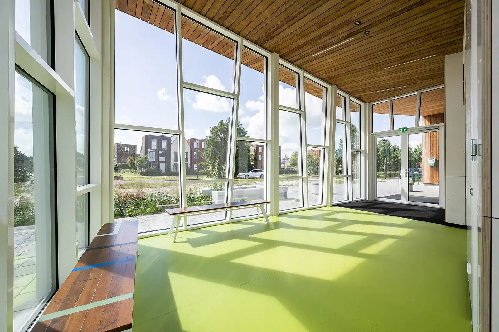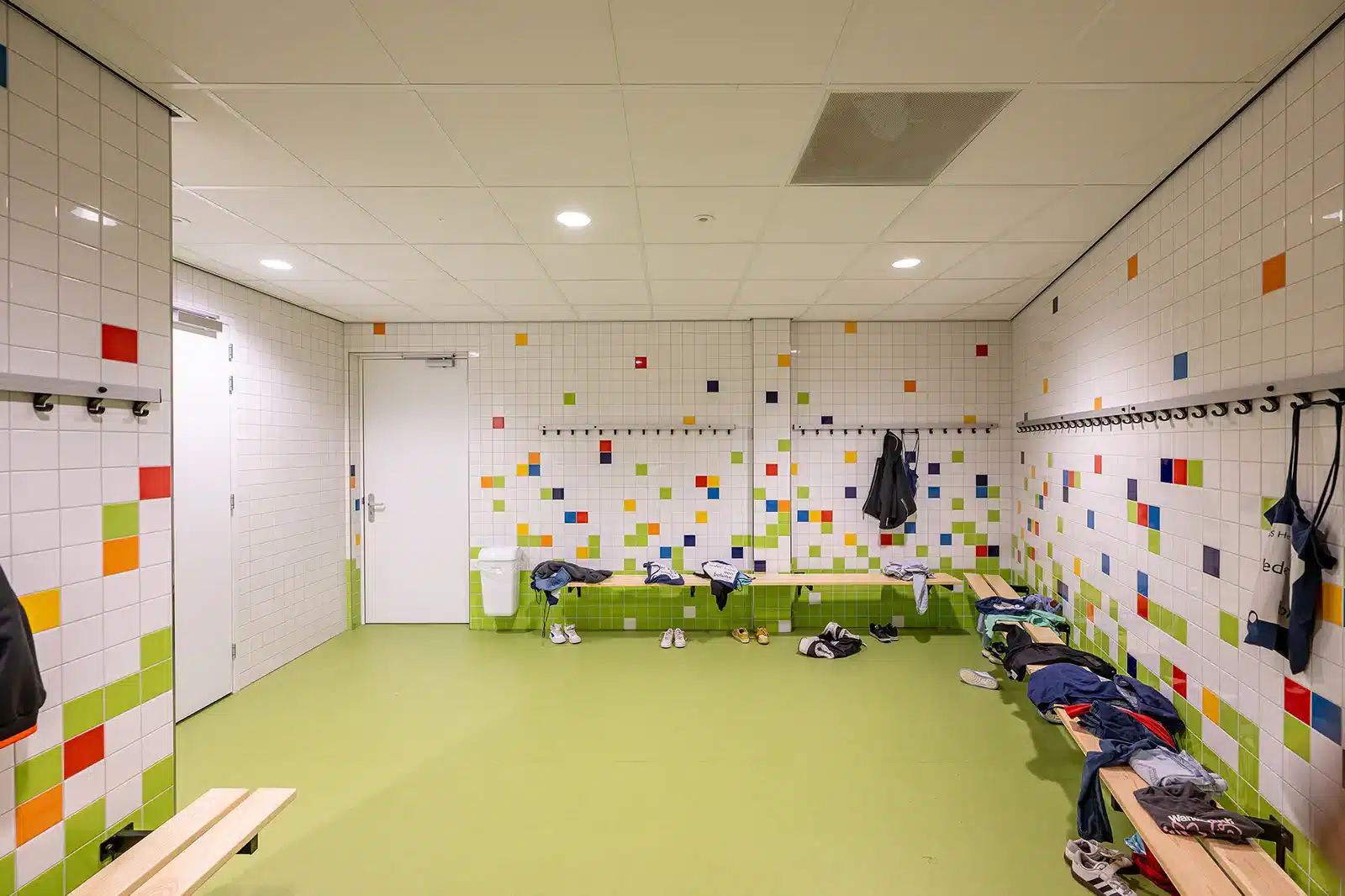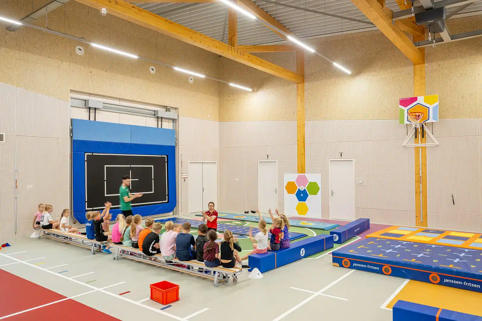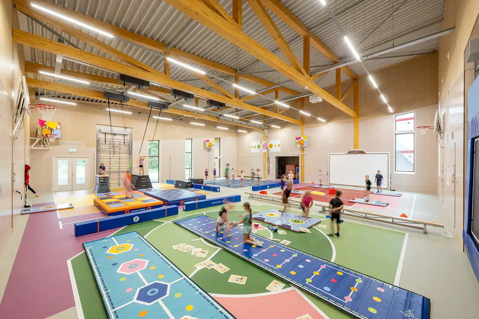 De indeling is overzichtelijk en logisch opgebouwd. Via de hoofdentree wordt de centrale hal bereikt, van waaruit de sportzaal, kleedruimten, bergingen en ondersteunende functies ontsloten zijn. De transparante gangzone langs het park en de tribunetrap aan het plein versterken de interactie tussen binnen en buiten. De sportzaal heeft een afmeting van 18 x 18 meter en is ingericht volgens het ASM-model, waardoor gelijktijdig meerdere bewegingsactiviteiten mogelijk zijn.